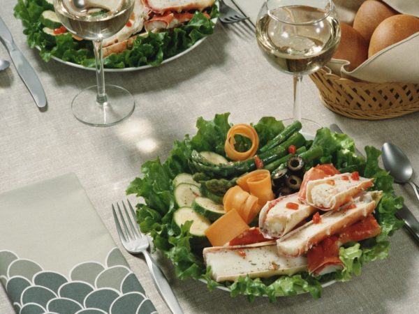 Une longue table est recouverte de plats jumelés afin qu'ils n'aient pas à être transférés d'un bout à l'autre et assez pour chaque invité. La même chose s'applique aux ensembles d'épices, de sauces et de spiritueux. Seule une corbeille de pain, tranchée et recouverte d'une serviette en tissu naturel, peut se tenir sur une table séparée à côté de l'hôtesse, qui la sert à la demande de l'invité. Il est souhaitable qu'il s'agisse d'au moins deux variétés - foncée et blanche.