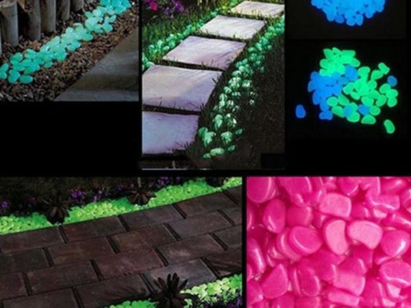 Pour décorer les pelouses, les allées et les parterres de fleurs, vous pouvez acheter des galets multicolores qui brillent dans le noir. Il suffit que les galets se couchent sous le soleil pendant une demi-heure, pour qu'après 10 heures ils soient semés avec de petites lumières.
