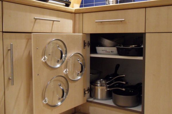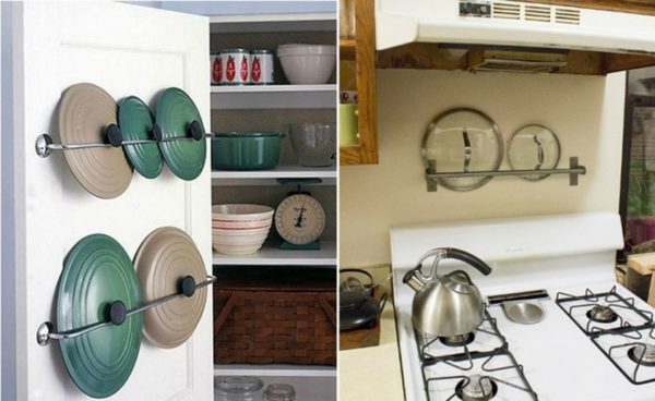 Beaucoup de femmes au foyer trouvent souvent qu'elles ne peuvent pas trouver un endroit pratique pour ranger les couvercles des casseroles et des pots. Mais si vous fixez les supports à l'arrière des portes des armoires de cuisine, le problème sera résolu rapidement et efficacement.