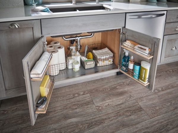 Pour y mettre une poubelle, vous devez lui allouer une armoire séparée, mais pourquoi, si le conteneur de collecte des ordures peut être fixé à l'arrière de la porte de la même armoire, et placez les autres éléments nécessaires dans la cuisine à l'intérieur.