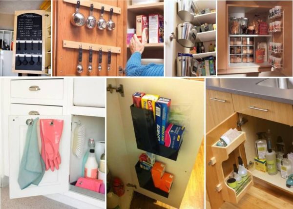 Ces conseils et idées simples vous aideront à organiser correctement et correctement le stockage des articles dans la cuisine. L'essentiel, lors de la fixation de crochets ou d'étagères, vous devez être sûr qu'ils résisteront à tous les objets. Pour les canettes lourdes, il est préférable d'utiliser des étagères massives. De plus, les crochets ne doivent pas toucher les étagères intérieures lorsque les portes sont fermées.