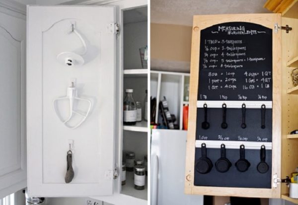 Pour mesurer les cuillères, il y a aussi une place à l'arrière des armoires. Nous utilisons des crochets, et pour l'originalité et l'avantage nous utilisons également une planche en ardoise, qui ne nous permettra pas de nous emmêler dans le système de mesures des ingrédients nécessaires à la préparation des plats.