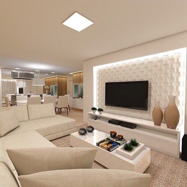 Actuellement, le salon est souvent combiné avec la salle à manger et / ou la cuisine. Lors de la planification de l'intérieur de ce type de pièce, vous devez réfléchir à la manière de la rendre visible de la télévision dans la plupart des zones de la pièce.