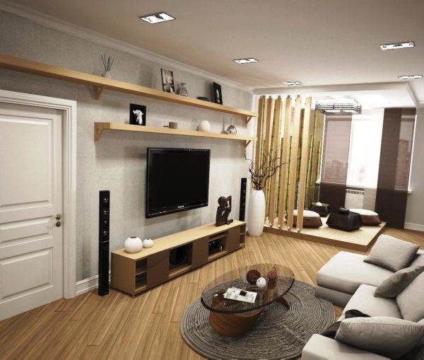 Tout d'abord, ils prêtent attention au facteur de «hauteur du téléviseur». Vous devez choisir avec soin un meuble ou un meuble sur lequel le téléviseur sera placé, afin qu'il corresponde à la hauteur du canapé et au niveau des yeux de ceux qui le regarderont.