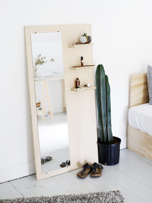 Dans sa fabrication ne nécessitera pas de compétences particulières. Il suffit de fixer un miroir et de petites étagères sur le contreplaqué acquis, où vous pouvez mettre tout ce dont vous avez besoin. Sur l'étagère supérieure, vous pouvez installer une plante d'intérieur, qui sera une merveilleuse décoration.