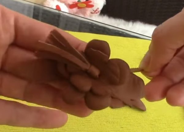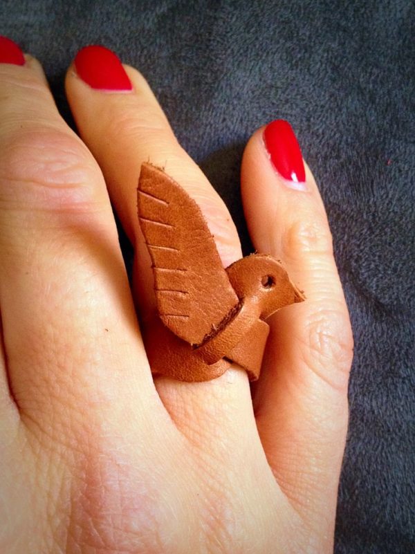 Si vous découpez une petite bande de peau au sens figuré, faisant d'une part une imitation de la tête d'un poussin, et d'autre part - sa queue, alors vous pouvez obtenir une bague à votre doigt. Pour qu'il soit monté à la main, 2 coupes doivent être faites d'un côté et l'autre bord de la bande doit être enfilé à travers.