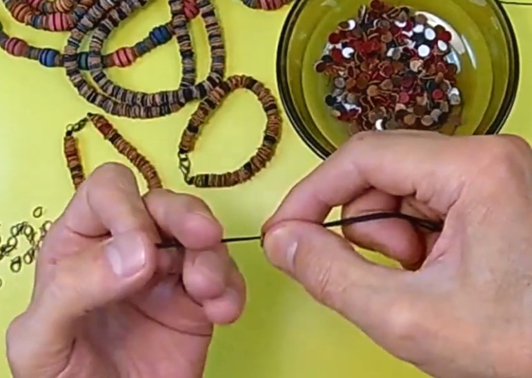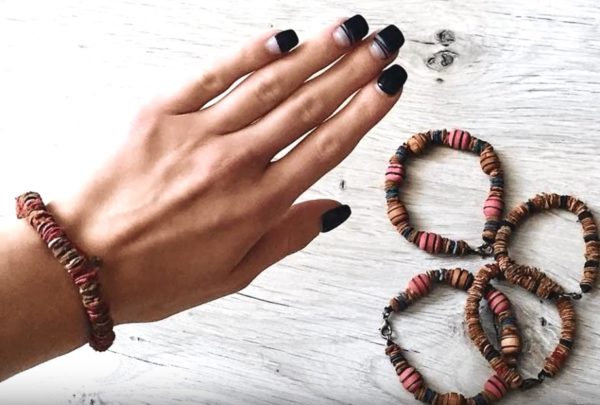 De très petits morceaux de cuir peuvent être utilisés pour créer un bracelet. Parmi ceux-ci, vous devez faire de petits cercles avec un perforateur et les enfiler sur une bande élastique ou un fil.