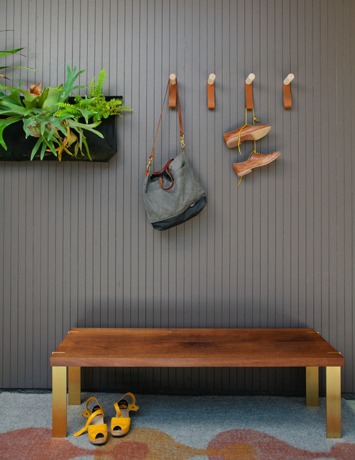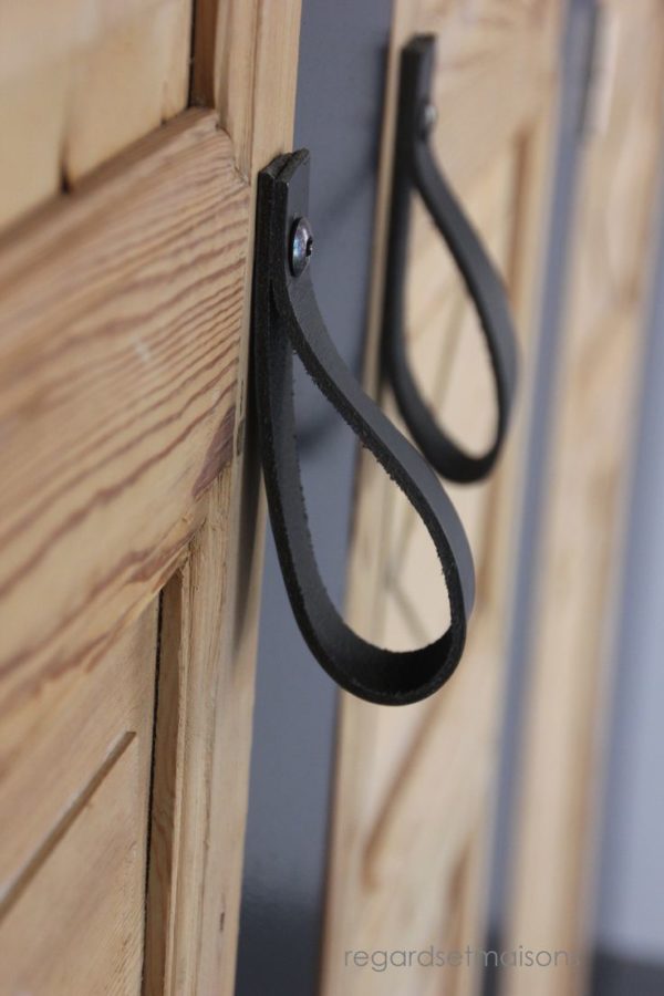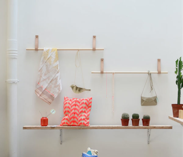 Des étagères élégantes peuvent être créées en utilisant des restes de cuir pour les attaches. Des bandes de cuir peuvent être fixées au mur de la poutre ou des barres qui forment des cintres, des supports ou des crochets.