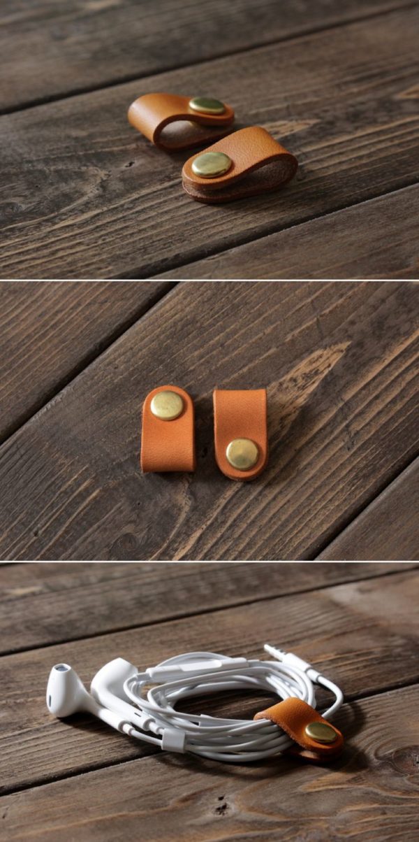 La bande de cuir sur le bouton sur les bords est un excellent support, grâce à laquelle un stockage précis des écouteurs filaires est assuré.