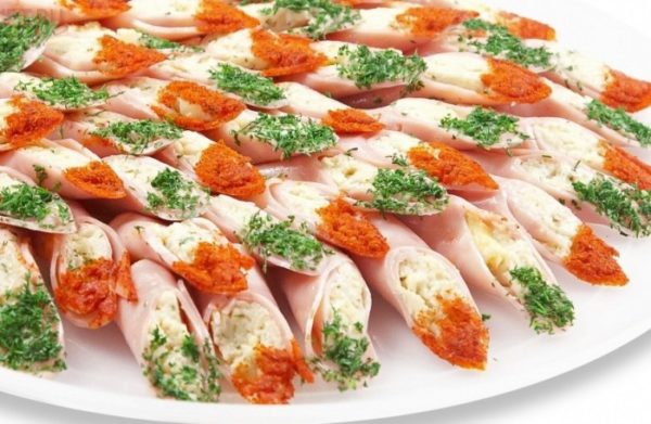 Les rouleaux sur la table du buffet sont magnifiques et originaux. Comme base, vous pouvez prendre du jambon et envelopper toute garniture, par exemple, des œufs brouillés ou des bâtonnets de crabe.
