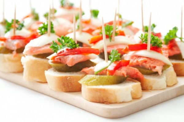 Un design intéressant pour le buffet est des mini-sandwichs et des canapés. Ils peuvent être préparés sur divers substrats, par exemple à partir de pain, de craquelins, de pâte feuilletée, de biscuits ou de croustilles non sucrés.