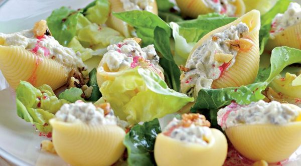 Pour faire une collation aussi nutritive et intéressante, vous devez faire bouillir les pâtes, les noix rôties au four ou dans une poêle sèche. Préparez ensuite la vinaigrette ainsi que la garniture au fromage à la crème.
