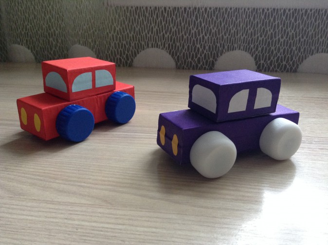 Pour ce faire, dans les endroits où les roues seront situées, vous devez faire un trou et insérer le goulot d'une bouteille en plastique. Il sera possible d'enrouler des couvertures dessus. L'enfant changera de couleur et la machine dans chaque jeu se révélera avec des roues différentes. Par de telles actions, le bébé, faisant des efforts, entraînera ses doigts. Cela a un effet positif sur le développement de la coordination.