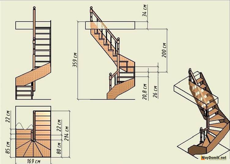 - Le coin a un virage, complété par une plate-forme devant la deuxième marche, qui tourne les marches de 90 °. Il occupera facilement un espace de coin, ménageant les jambes et le dos lors de la descente ou de la montée.