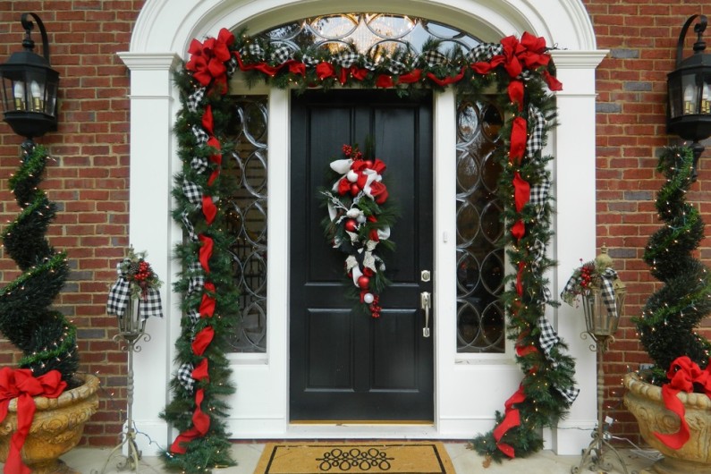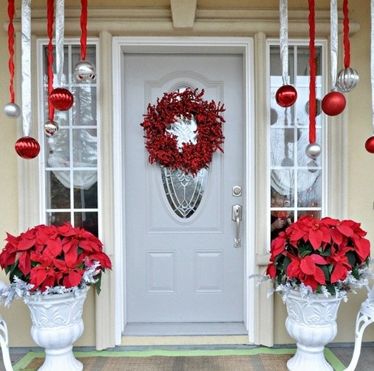 L'entrée de la maison est une zone importante, qui est également capable de transmettre l'atmosphère des vacances. La décoration principale à l'extérieur de l'entrée de la maison peut être une couronne qui peut être fixée à la fois au mur et à la porte de la maison.