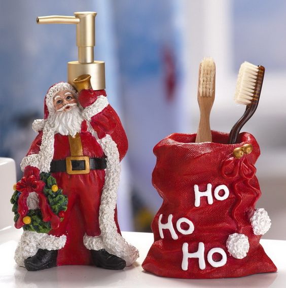- Accrochez le rideau rouge à la fenêtre, s'il se trouve dans la salle de bain, ou placez un rideau dans cette pièce pour vous protéger contre les éclaboussures avec un design adapté, un tapis au sol sous l'évier, qui est décoré de dessins du Nouvel An.