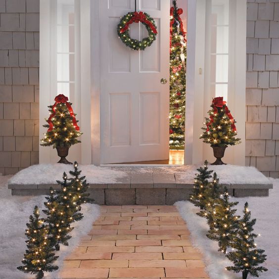 - À l'entrée de la maison, vous pouvez placer de minces rangées d'arbres de Noël artificiels de taille miniature. Décorez-les avec les mêmes guirlandes brillantes.