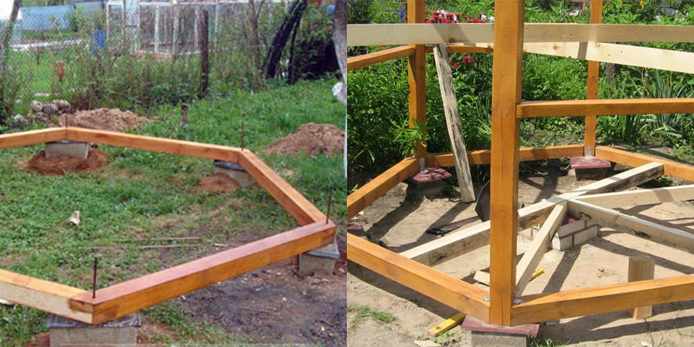 Un gazebo est une structure légère, souvent en bois, il ne nécessitera pas de base de capital. Ici, vous pouvez poser une fondation en blocs qui durera plus d'une décennie. Pour commencer, vous devez préparer le site: enlever l'herbe, niveler le sol. Ensuite, selon le niveau, installez 9 blocs de 20x20x40 cm et posez dessus un matériau de couverture qui protégera le faisceau inférieur de la pourriture.