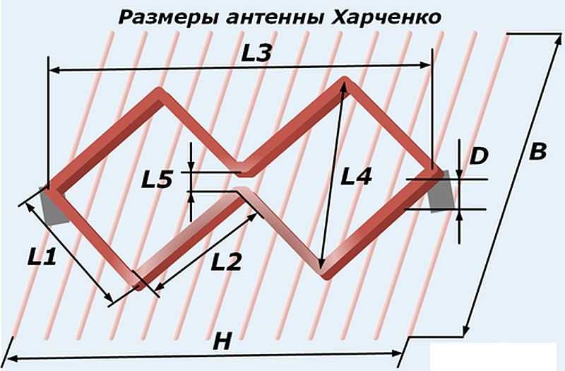 Pour le bon fonctionnement de la future antenne, les dimensions sont importantes. L'antenne en zigzag elle-même se compose de deux carrés, interconnectés en un joint et unis sous la forme d'un huit. Réflecteur - une partie supplémentaire de l'appareil, amplifiant le signal. Il ressemble à une grille avec des tiges transversales et un rebord autour du périmètre. Se fixe avec un isolant / câble sur un conducteur courbe. Trouver un dessin pour plus de clarté et une calculatrice pour compter les données est facile. Cela vaut la peine de lancer la recherche: "Antenne Harchenko pour le calcul de la télévision numérique à faire soi-même" et la calculatrice est accompagnée d'un dessin. Il est donc important de mesurer: