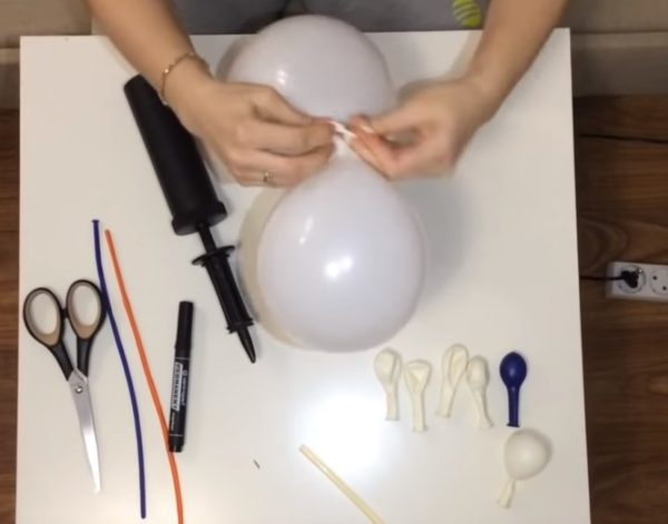 - Vous devez prendre 6 ballons blancs, 2 bleus, dont 1 de forme oblongue, ainsi que 1 ballon orange oblong. Vous devez alternativement pomper 1 ballon blanc à la plus grande taille, le second plus petit. Les 4 autres devraient avoir un diamètre 2 fois plus petit que les deux précédents.