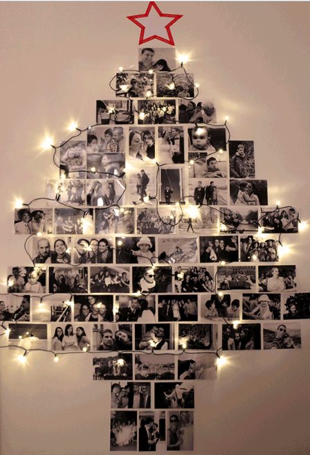 - Sélectionnez des photos de couleur et de taille appropriées, fixez-les au mur pour que la composition ressemble à un sapin en forme.