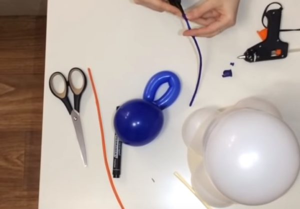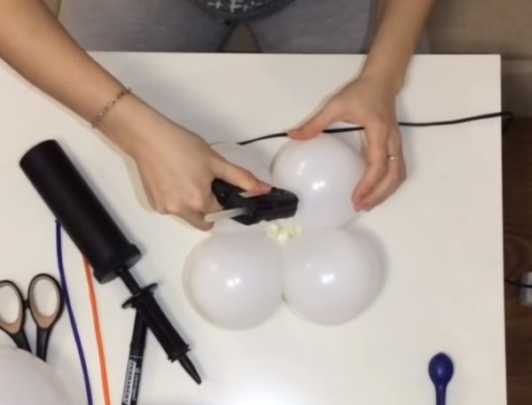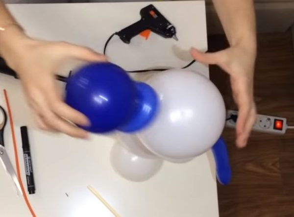 - Vous devez prendre 6 ballons blancs, 2 bleus, dont 1 de forme oblongue, ainsi que 1 ballon orange oblong. Vous devez alternativement pomper 1 ballon blanc à la plus grande taille, le second plus petit. Les 4 autres devraient avoir un diamètre 2 fois plus petit que les deux précédents.