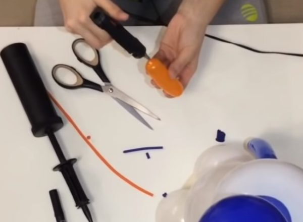 - Gonflez la boule orange oblongue sur 1/4 de la longueur, tenez-vous à la plus grosse boule devant pour faire le nez du bonhomme de neige.