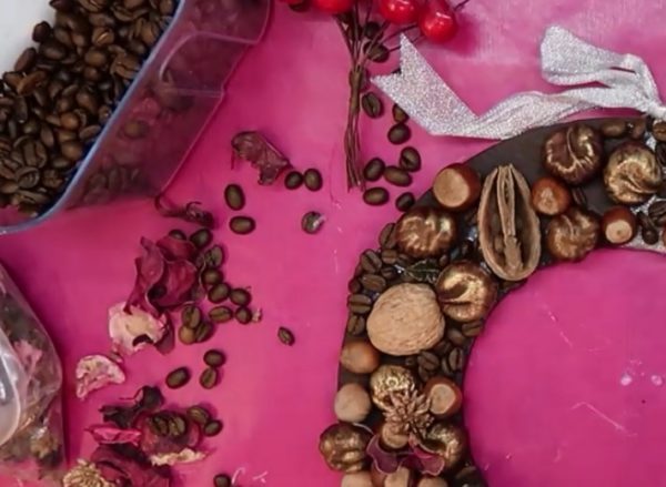 - Les zones entre les noix sont remplies de grains de café, qui sont également plantés sur de la colle.