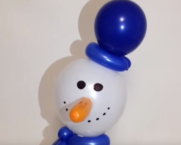 - Gonflez une boule bleue de forme oblongue sur la moitié de sa longueur. Coupez. Gonflez l'autre boule bleue aux 3/4 de sa longueur, nouez autour de la jonction des deux plus grosses boules. Formez ainsi un foulard bonhomme de neige.