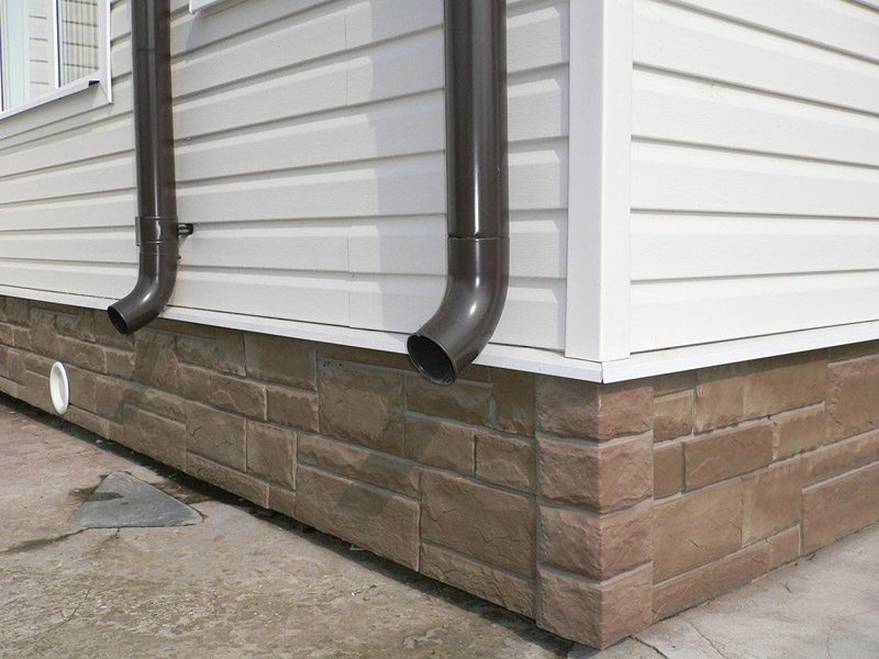 Vous pouvez recouvrir les fondations de la maison avec un revêtement de sous-sol. Il se compose de vinyle, léger et son coût est faible. Malgré la légèreté et la spécificité du matériau, le parement est bien adapté pour le revêtement monobloc de la façade extérieure d'une maison simple. Le matériau imite avec succès le bois, la brique, la pierre artificielle. Il a l'air magnifique et le fixe à la colle pour les panneaux de vinyle. Les panneaux sont équipés de serrures, qu'ils doivent être connectés les uns aux autres lors de l'installation. Le matériau est conçu pour être monté sur une caisse de cadre, par conséquent, une couche d'isolation est posée entre celui-ci et le cadre pour réduire les pertes de chaleur.