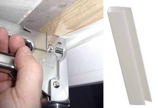 - Le profil regardant sur le mur est traité avec du mastic brut. Quand il sèche, on ferme le coin et les vis sur le bord du plastique avec un coin décoratif. Fixez-le au silicone.