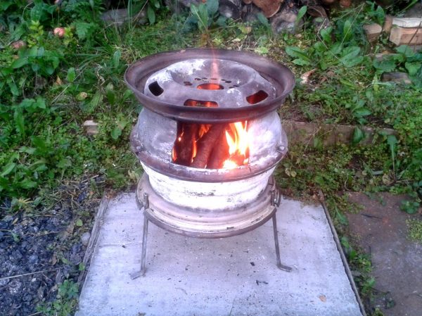 La principale caractéristique du poêle à jantes à partir de jantes est que pour sa fabrication, vous n'avez pas besoin de dépenser de l'argent pour l'achat de tôles d'acier et d'autres matériaux coûteux. Pas besoin de prendre des mesures, de couper des pièces et de les assembler. Un design fait maison ne remplit pas sa tâche pire que des appareils coûteux pour la cuisson sur un feu ouvert de fabrication en usine.