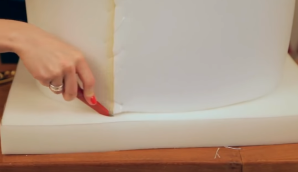 - Coupez un rectangle dans le caoutchouc mousse selon la hauteur de la pièce et la longueur égale à sa circonférence. Enveloppez la pièce avec de la mousse et cousez-la.