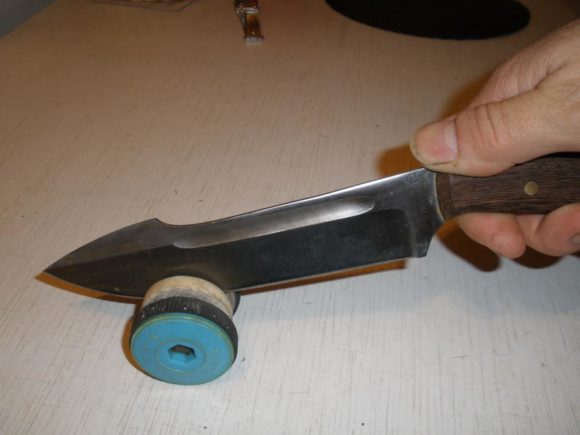 Un outil d'affûtage simple mais efficace. Vous devez prendre une petite barre avec la face supérieure, dans une forme ressemblant à un toit à pignon. Chaque face doit être inclinée selon un angle de 20 à 25 degrés. La lame du couteau est solidement fixée à la crête du "toit", et son autre côté est traité avec un bloc ou un cercle dans le sens horizontal. Grâce à la barre de toit, l'angle d'inclinaison reste toujours inchangé.