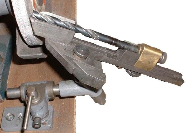 L'outil d'affûtage d'outil le plus simple est constitué d'un tube métallique. Le diamètre intérieur d'une telle pièce doit correspondre au diamètre extérieur du foret. Le manchon lui-même doit être fixé sur une base fixe avec le calcul de l'angle par rapport au plan de l'affûteur. Comme base pour un tel travail fait maison, un bloc de bois est coupé à l'angle nécessaire pour l'affûtage.