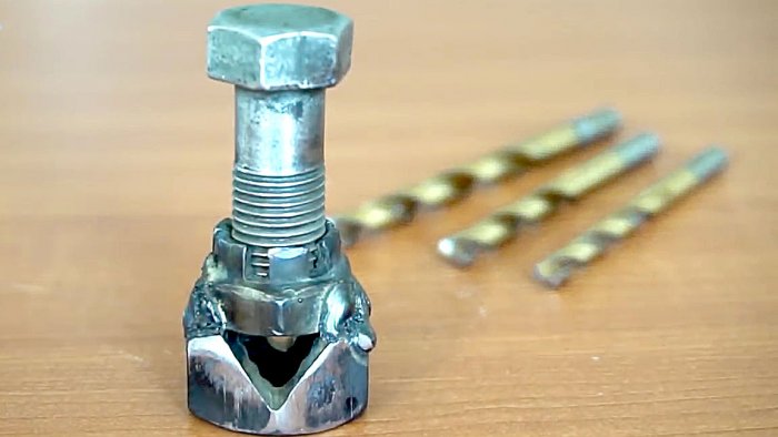 Une version simple de l'appareil pour maintenir avec précision l'angle lors de l'affûtage peut être constituée d'un écrou. La base est le détail principal de la conception. La forme de l'écrou a la forme d'un hexagone exact - l'angle entre chaque paire correspond à la norme pour les mèches universelles pour le métal 120 °. Pour la fabrication, les coupes sont faites entre des angles opposés - la conception est simple, par conséquent, les dessins ne sont pas nécessaires. Pour simplifier le travail avec l'appareil, il est souvent modifié comme suit: