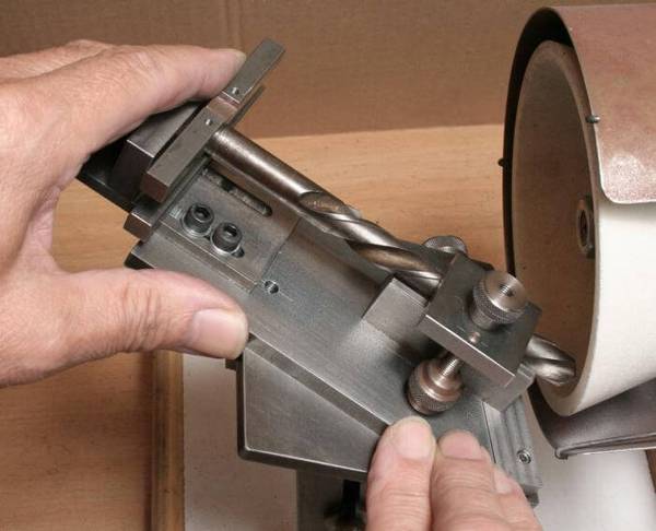 Pour affûter la perceuse, vous pouvez utiliser des supports à main. Cette conception dans sa propre structure n'a pas de parties technologiques. Le foret est fixé dans la rainure et les ailes latérales aident à résister à l'angle par rapport à la surface de la roue d'émeri ou de la pierre. L'objectif principal du support à main est de protéger vos mains lors de l'affûtage d'un outil. Parmi les avantages:
