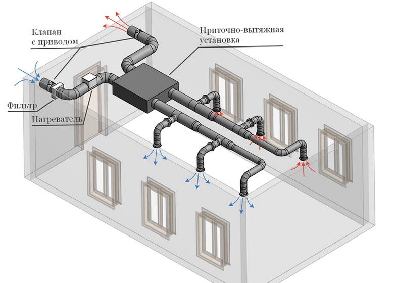 Le dispositif de circulation forcée fournit un taux élevé de renouvellement d'air dans la pièce, car il peut être utilisé dans des maisons d'une plus grande surface. Les conduits d'air dans ces CB sont installés sous le toit et ils ont une grande longueur sur le bâtiment. De tels systèmes peuvent être équipés de dispositifs supplémentaires pour la purification de l'air d'alimentation et la recirculation.