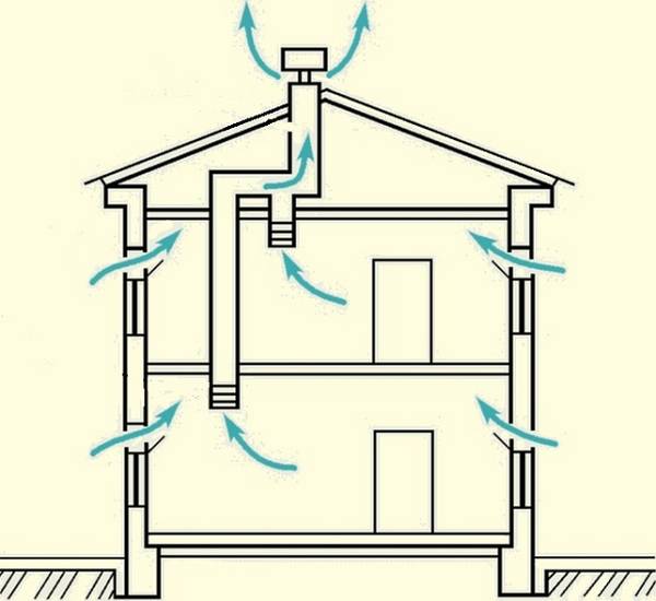 Une version distincte du système de ventilation de la pièce est une cheminée, qui devrait assurer l'élimination des produits de combustion des appareils de chauffage - un poêle ou une chaudière, à la fois à combustible solide et à gaz. Avec un système d'écoulement naturel, la substitution se produit en raison de la plus grande densité et gravité de l'air froid, qui déplace l'intérieur chauffé. Le taux de substitution dans un tel SW est négligeable. S'il y a des segments du parcours de ventilation en position horizontale sur 8 mètres, il est préférable d'utiliser des systèmes forcés.