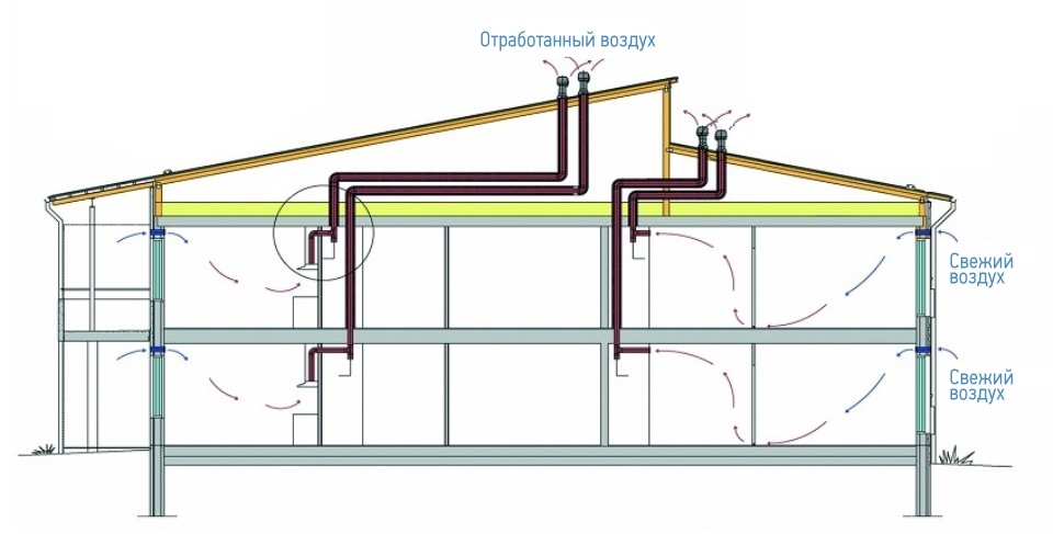 Pour fournir aux bâtiments résidentiels une ventilation, différents systèmes sont utilisés.La division principale est effectuée sur l'offre et la production, ainsi que naturelle et forcée. L'alimentation en air d'alimentation signifie uniquement l'alimentation en air frais de la pièce, et l'évacuation assure la purification de l'air. Une version distincte du système est la ventilation avec recirculation. Ces types de ventilation fournissent de l'air à la maison à partir du canal d'échappement lorsqu'ils sont mélangés à l'extérieur, de sorte que le chauffage à la température souhaitée se produit.
