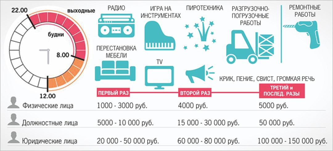 Si la police révèle une violation du régime du silence, une amende de cinq cents roubles sera infligée. Avec une plainte répétée de voisins, le montant augmente de 2 fois. Si, par exemple, un constructeur embauché ou un autre fonctionnaire est à blâmer pour la violation, le montant de la plainte initiale sera de 1 500 roubles et jusqu'à 10 000 pour une violation répétée. Les personnes morales sont punies dans une fourchette de 10 000 à 30 000, l'organisation, s'il y a des preuves, encourt non seulement une amende de 10 à 20 000, mais également une suspension d'activité pour une période pouvant aller jusqu'à trois mois.