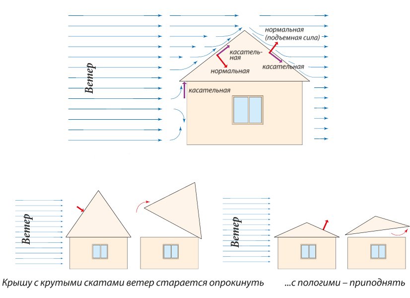 Le vent exerce une pression latérale sur les murs de la maison et le toit. En entrant en collision avec un obstacle, le flux d'air est distribué, descendant jusqu'aux fondations et remontant dans les avant-toits du toit. Si vous ne calculez pas la pression du vent, la toiture peut simplement être perturbée par le vent d'ouragan. Une telle destruction ne peut pas toujours être réparée par une réparation esthétique, ce qui conduit souvent à la nécessité de remplacer le toit. Un indicateur important lors du calcul de l'impact du vent tient compte du coefficient aérodynamique. Cela dépend de l'angle du toit. Plus la rampe est raide, plus la charge est importante et le vent tentera de «renverser» le toit. Si l'angle de votre toit est petit, le vent agira sur le toit comme une force de levage, essayant de le déchirer et de l'emporter. Pour éviter que cela ne se produise, vous devez observer correctement la conception du toit. La stabilité du système de chevrons dépend de la fourniture d'une rigidité spatiale, qui consiste en la combinaison correcte des croisillons, des croisillons et des liens diagonaux, ainsi que de leur fixation rigide les uns aux autres. De plus, le vent peut transporter des objets qui, en cas de collision avec le toit, laisseront des dommages mécaniques. Pour éviter cela, vous devez choisir soigneusement la toiture et organiser correctement la caisse pour son installation.
