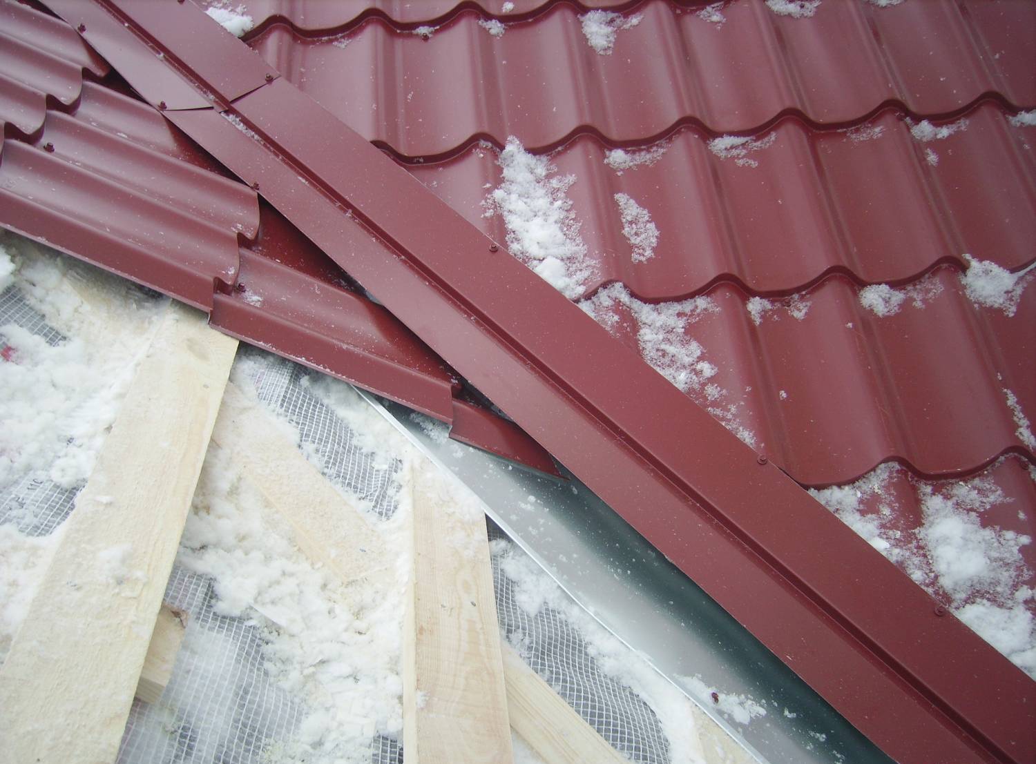 Lors de l'installation d'un toit à partir d'une tôle profilée ou d'une tuile métallique, le matériau est posé à une distance de 10 cm des deux côtés de la ligne du coin intérieur. À la toute fin, l'endova supérieur ou un revêtement décoratif est monté.Une telle superposition est montée, comme l'endova inférieure avec un chevauchement de 10-12 cm de bas en haut.