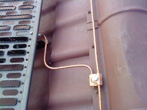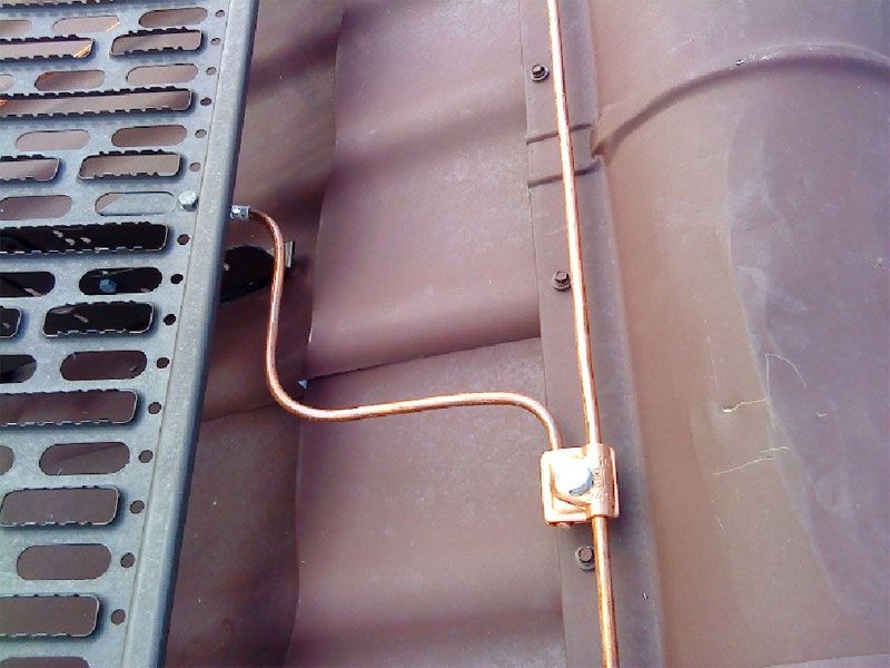 Conducteur de descente Il s'agit d'un fil épais d'un diamètre de 5-6 mm. L'acier galvanisé sera un bon matériau. Un conducteur descendant est situé dans un endroit où la foudre est censée frapper. Par exemple, un patin ou le bord d'un fronton peut devenir un tel endroit. Le conducteur de descente est attaché pas tout à fait près du bâtiment. Il est nécessaire de reculer d'une distance de 15 à 20 cm.Si nous parlons d'un toit en matériaux inflammables, vous devez être particulièrement prudent et assurez-vous de laisser un espace. Comme attaches, vous pouvez utiliser des agrafes, des clous ou des pinces.