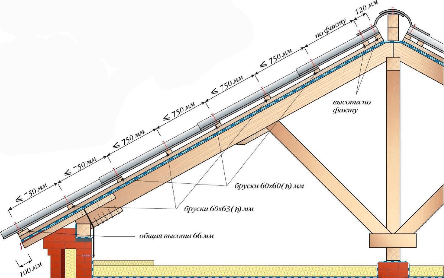 - À la crête, remplissez deux lattes avec un intervalle de 120 mm. Non seulement les matériaux de couverture, mais aussi les éléments de faîtage seront fixés sur le fond.