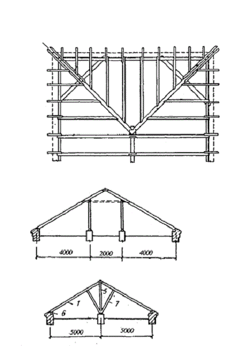 Les maisons avec un mur porteur moyen utilisent également un système de chevrons du toit du grenier. Les dessins sont donnés ci-dessous. La ceinture inférieure avec un support au centre de la charge est souvent facilitée. La hauteur des plafonds dans les logements mansardés doit être d'au moins 2,5 m, mais en même temps, une partie de la pièce avec une hauteur inférieure peut également être incluse ici. La zone de la zone de moindre hauteur est soumise à une standardisation stricte. Il convient de noter que plus la pente des pentes du toit est grande, plus l'espace de toit est spacieux. En conséquence, avec une pente de 30 degrés, la hauteur minimale est d'environ 1,2 m, avec une pente de 45-60 degrés - 0,8 m, plus de 60 - n'est plus normalisée. La largeur de la pièce doit être d'au moins 2,4 m.