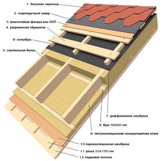 Le dispositif le plus simple de la toiture du grenier se réduit à la création des couches suivantes: