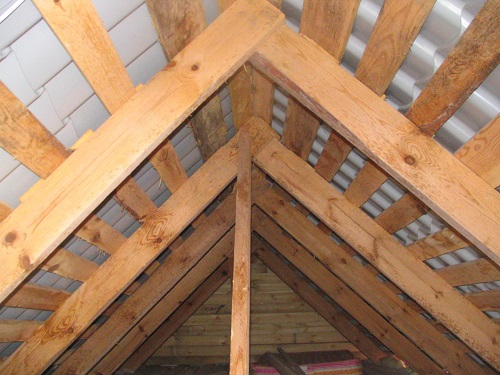 Si le toit du bâtiment est construit à partir de matériaux lourds, par exemple à partir de tuiles naturelles, les poutres latérales sont faites sous la forme d'un culbuteur, pour cela les bûches sont légèrement suspendues et pliées.