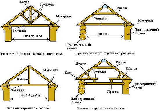 Un même toit peut être constitué de chevrons suspendus et suspendus à la fois: là où il y a un support intermédiaire - les chevrons sont érigés, et là où il n'y a pas - de pendaison.