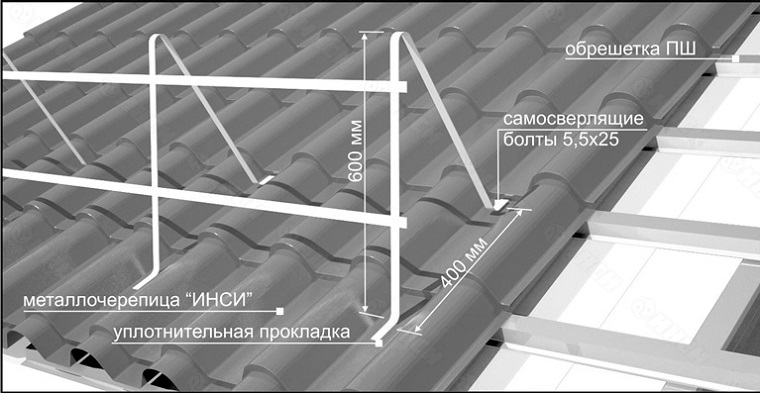 Ce nœud est monté en deux étapes. Pour commencer, le pare-neige est fixé avec une vis autotaraudeuse ou un clou. La tête de vis ou de clou, ainsi que le trou de montage lui-même, doivent être scellés avec du mastic bitumineux. La rétention de neige est nécessaire pour empêcher l'accumulation de neige dans des endroits indésirables. Par exemple, ils sont installés au-dessus de l'entrée du bâtiment, ils sont également nécessaires pour protéger les gouttières. Sous la deuxième marche transversale du toit métallique, un arrêt de neige est installé. Au sommet de chaque vague de profil, une barre de support est fixée entre la feuille de matériau de toiture et le bord supérieur de l'arrêt de neige. Pour monter le pare-neige directement sur la caisse, des vis longues doivent être utilisées. Au sommet de chaque seconde vague du profil, le bord inférieur de l'arrêtoir à neige est fixe. dans ce nœud du toit, il est possible d'installer non seulement une barre d'un arrêt de neige, mais aussi un arrêt de neige tubulaire.
